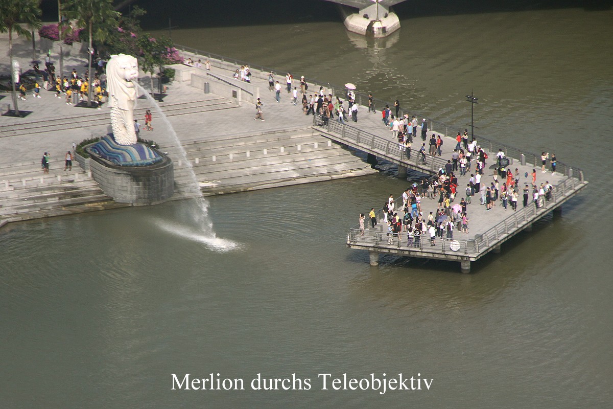 Da Tomoko nicht an einer Besichtigung interessiert war, fuhr sie schon mit der U-Bahn zur Orchard Road, wo wir uns um 11.00 h treffen wollten. Es war gerade 9.30 h, als die Kasse öffnete, wo man Tickets (20,- SIN$) für den "Skywalk" kaufen konnte. Ich war einer der ersten der mit einem Express-Aufzug zur 57. Etage hochfuhr. Die Aussicht von hier oben verschlug mir fast den Atem. Ich machte etliche Fotos in alle Richtungen, einmalig diese Aussicht… Besonders verrückt fand ich, dass hier in luftiger Höhe ein riesiger 147 m langer Swimmingpool existiert, der schon gut von Hotelgästen genutzt wurde. |