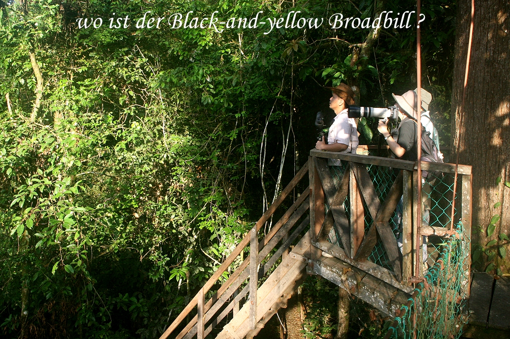 Der letzte Tag in Danum Valley war angebrochen. Diesmal standen wir um 6:00 Uhr auf und trafen uns vor dem Frühstück um 6:30 Uhr zu einem Morgenspaziergang Richtung Canopy-Walk. Das Wetter war gut und um 7:00 Uhr erreichten wir die Abzweigung. Wir wünschten uns sehr, den Black-and-Yellow Broadbill noch mal zu sehen, den Tomoko vorgestern verpasst hatte. Sie war sehr tapfer und schaffte es trotz ihrer Höhenangst, die erste schwankende, an Drahtseilen die Schlucht überspannende, Brücke bis zur ersten Plattform zu überqueren. |