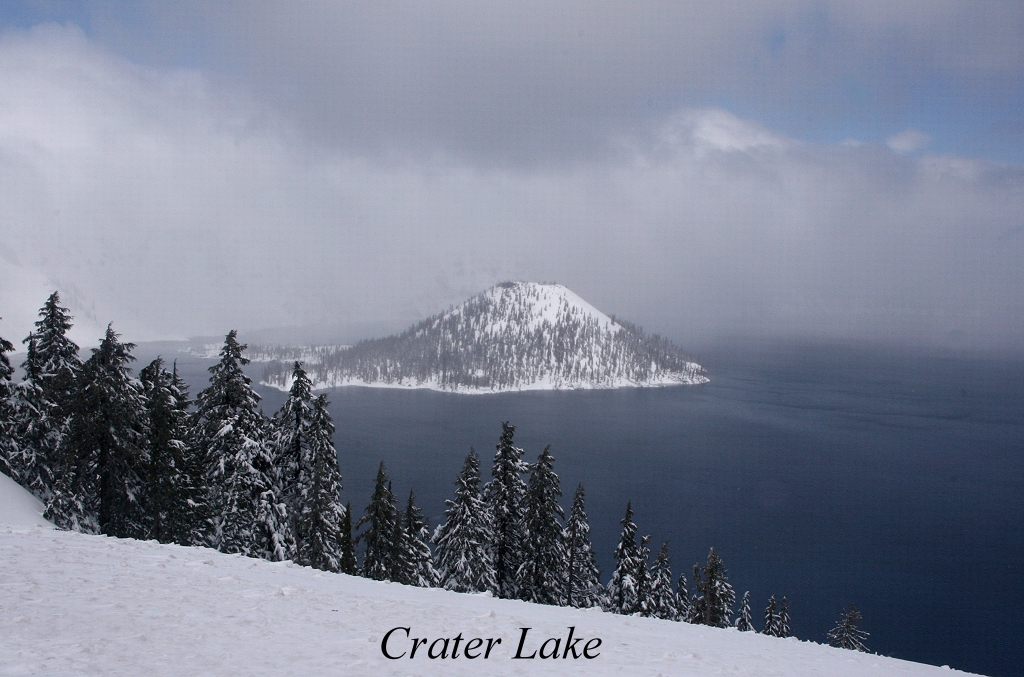 Da wir noch weitere Nationalparks auf dieser Reise besuchen wollten, kauften wir für 80,- $ einen Jahrespass für alle USA-Nationalparks. Die letzten 4 Meilen bis zum Kraterrand gingen steil nach oben bis auf eine Höhe von 2177 m. Die Schneewand rechts und links war stellenweise 3 bis 4 m hoch. Es schneite leicht, doch immer wieder lugte auch die Sonne zwischen den Wolken hervor. Oben angekommen war es zunächst schwierig einen Parkplatz zu bekommen. Nur wenige Plätze waren geräumt, die restlichen lagen unter meterhohem Schnee begraben. Wir gingen zu Fuß bis zum Kraterrand. |
