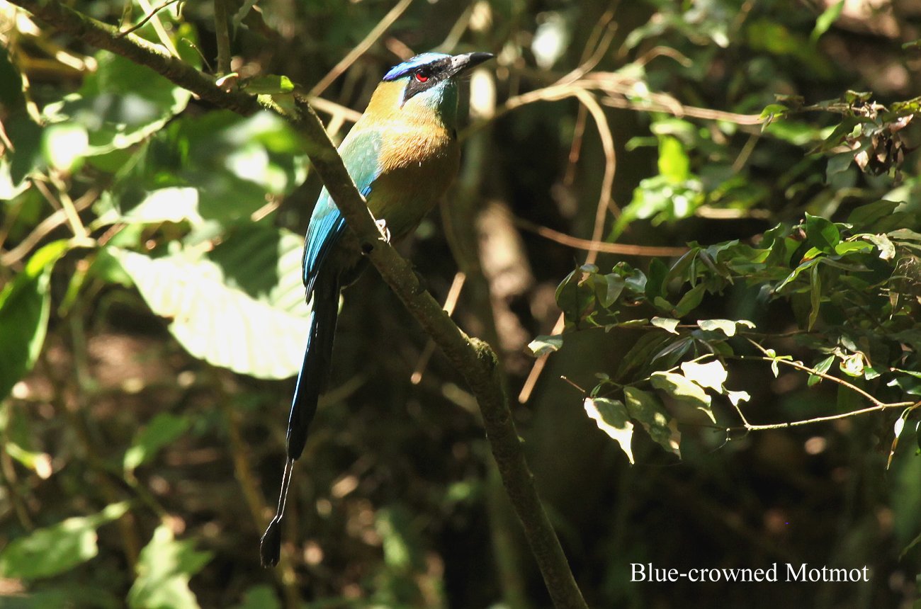 In Las Cañas bogen wir nach Norden ab Richtung Tilarán. Die Straße war sehr eng und kurvig, dabei ging es ständig bergauf. Von Tilarán ging es immer noch weiter bergauf Richtung St.Elena. 31 km vor St.Elena hörte die bisher gute Straße auf und es begann eine furchtbare Rüttelpiste. Ich musste auf Vierradantrieb umschalten. Teilweise waren die Steigungen so steil, dass ich in den 1.Gang der Automatik schalten musste. Stellenweise kämpften wir uns Meter um Meter voran. In einer Kurve flog plötzlich ein blauer Vogel heran und verschwand neben uns im Gebüsch. Tomoko stieg aus und konnte einen wunderschönen Blue-crowned Motmot fotografieren. Als ich ebenfalls ausstieg um zu schauen, war der Vogel leider verschwunden. |