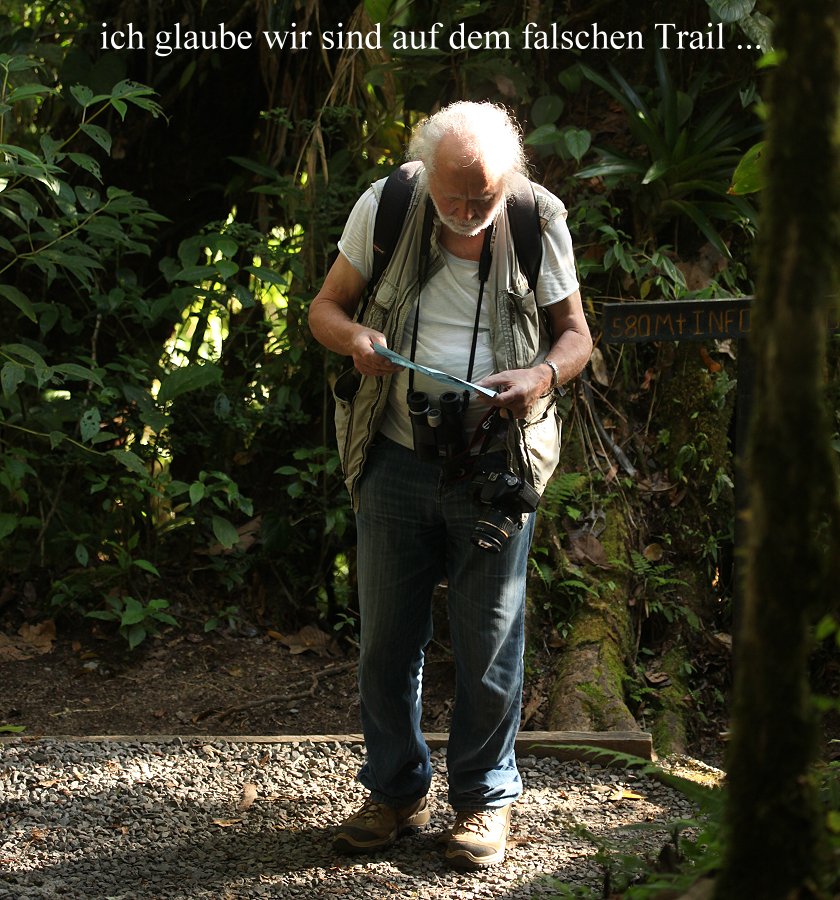 Um 5:30 h wurden wir wach. In der Nacht blieb es trocken und als wir aus dem Fenster schauten, sah das Wetter ganz passabel aus. Also blieben wir nicht lange liegen, sondern nahmen Fernglas und Fotoapparat in die Hand und machten gegen 6:00 h einen kleinen Spaziergang, diesmal in Richtung des Trails, den wir gestern bei der Führung genommen hatten. Einer der Hunde Pablos folgte uns. Wir befürchteten schon, dass der Hund wohl alle Vögel vertreiben würde. Das war aber nicht der Fall , im Gegenteil, der Hund trottete brav mit uns daher und ließ sich von Tomoko und mir immer wieder streicheln. |