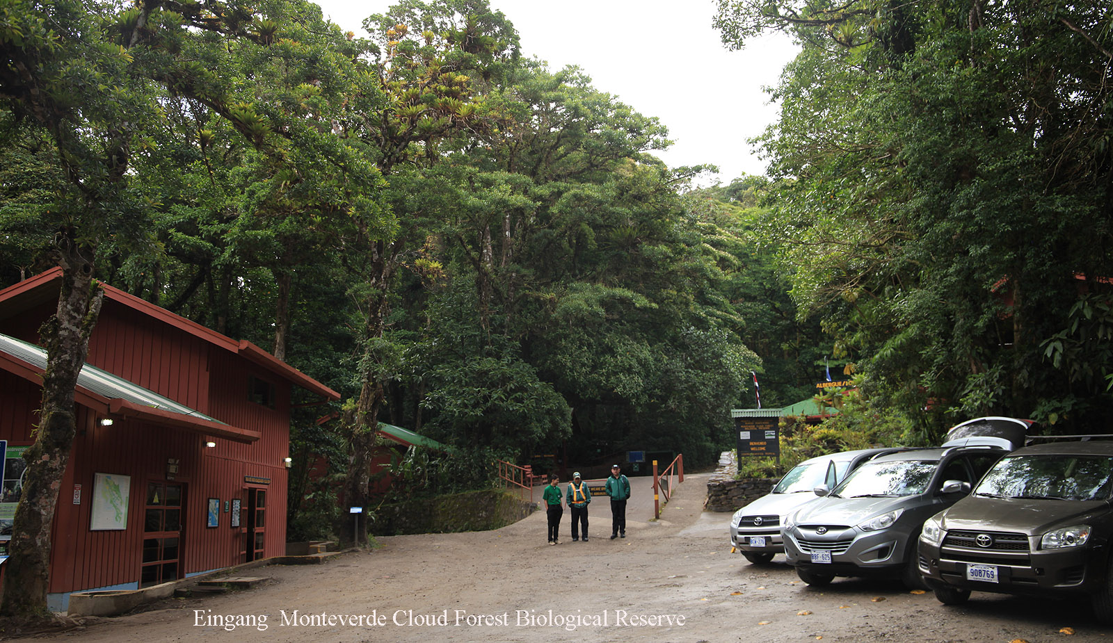 Wir wurden um 5:20 h wach. Das Doppelbett war sehr groß und mit einer unglaublich bequemen Matratze ausgestattet. Auch die Bettwäsche fühlte sich sehr angenehm an. Infolgedessen hatten wir gut geschlafen. Heute war mein 70. Geburtstag. Tomoko hatte eine wunderschöne Geburtstagskarte gemalt und alle mitgekommenen Tiere (Pa'chen, Brumma, Äffchen, Entelchen, Bärchen und Krächzi) haben auch ganz herzlich gratuliert. Nach einem ersten Kaffee und einem Schinkentoast fuhren wir um 6:15 h los die 3 km bis zum Eingang des Monteverde Nationalparks. Kurz vorher bogen wir mal kurz ab zu einen relativ unbekannten Park , Curi-Cancha Reserve. Der war aber um 6:45 h noch nicht offen, so dass wir weiterfuhren. Es nieselte ein wenig, als wir beim Monteverde Nationalpark ankamen. Vom Quetzal keine Spur, dafür ganz nah ein Black Guan. |