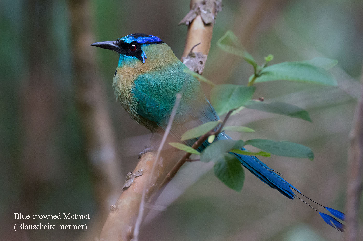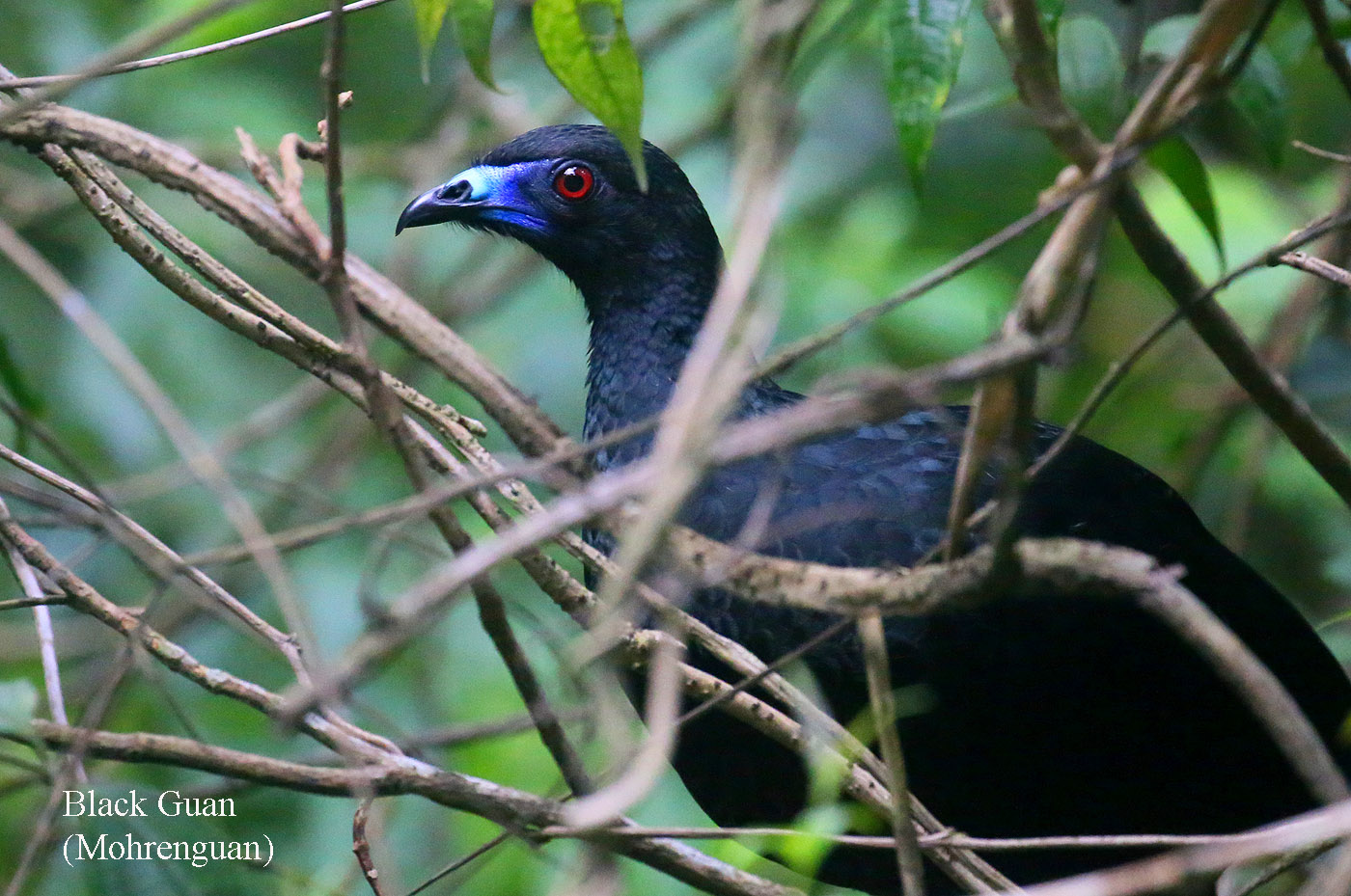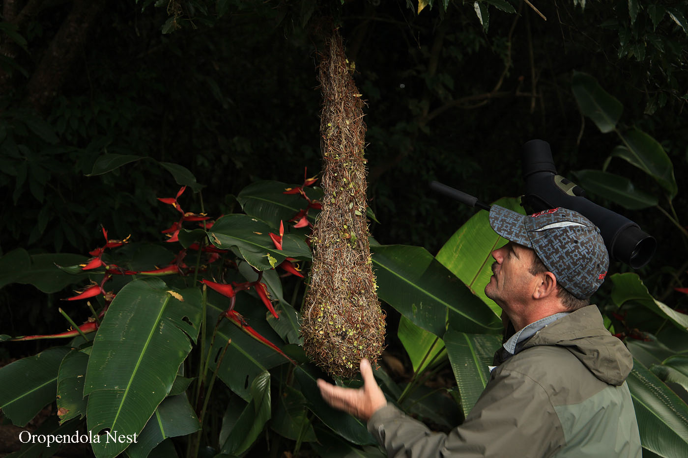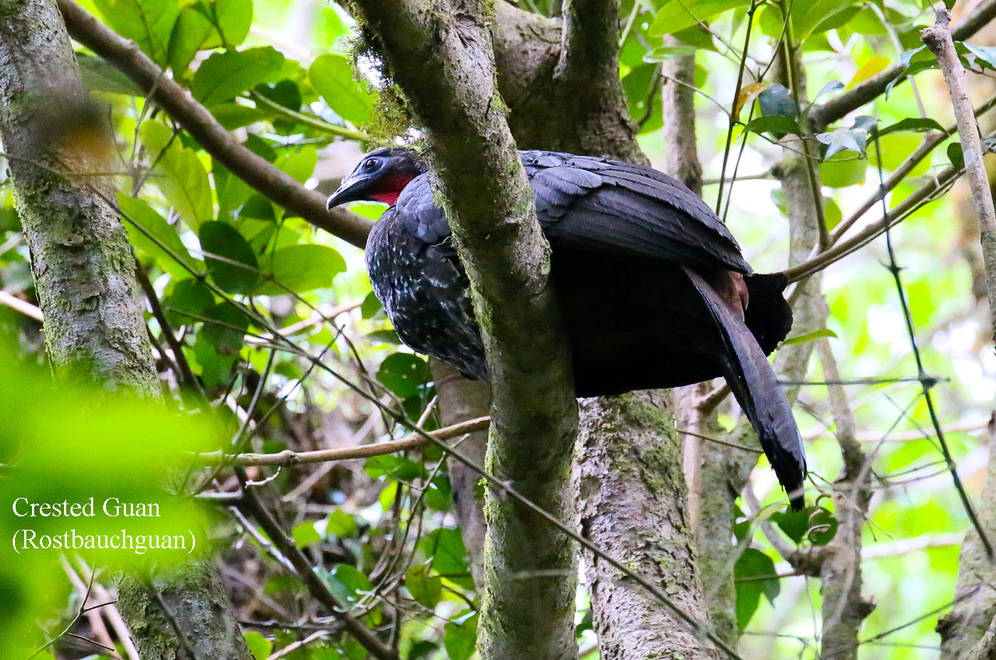 Wir warteten einige Zeit, gingen dann aber weiter. Ganz hoch in einem Baum entdeckte Adrián einen Crested Guan. Man musste sich fast den Hals verrenken um ihn zu sehen. Wir erreichten eine Wiese mit kleinen Obstbäumen, in denen einige Vögel umherflatterten. |