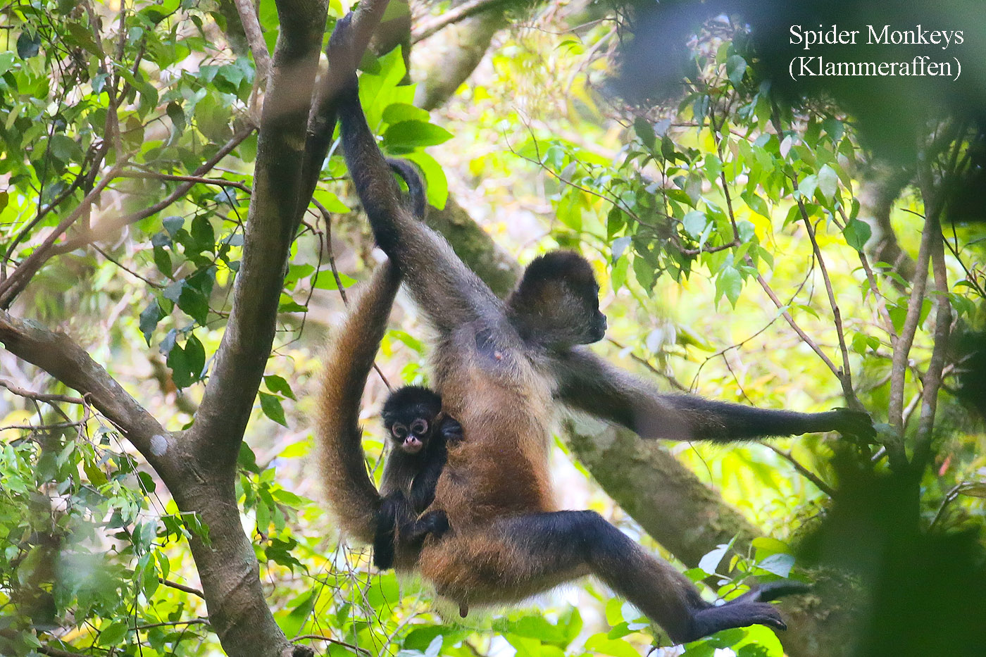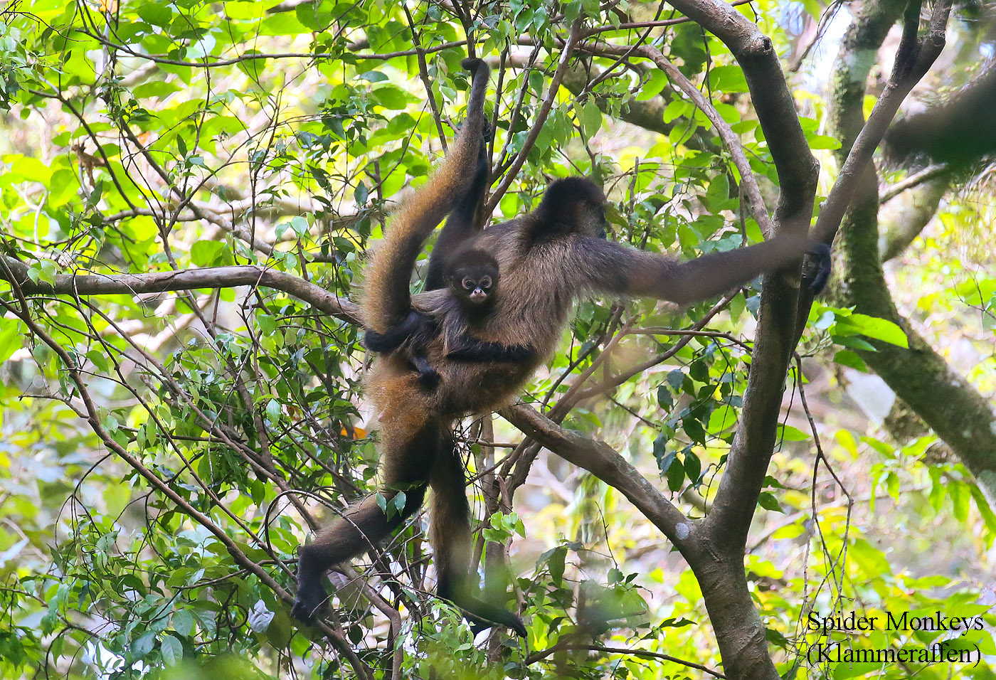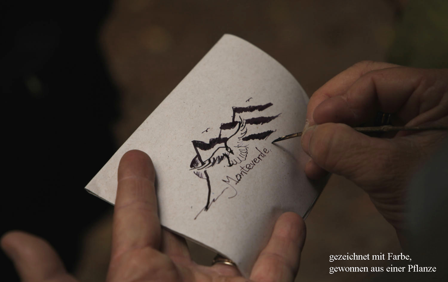 Wir sahen in den nächsten 3 Stunden sehr viele Vögel, Schmetterlinge, tropische Pflanzen usw. Adrián war unglaublich geschickt im Aufspüren von Tieren, die er dann in Windeseile mit seinem Spektiv erfasste. Ich hatte auf Anraten Tomokos mein Spektiv im Auto gelassen und stattdessen mein kleines Stühlchen mitgenommen, eine super Idee. Es ging ziemlich steil bergauf durch den dichten Urwald, der immer feuchter wurde, je höher wir kamen. Plötzlich tauchten hoch über unseren Köpfen einige Klammeraffen (Spider Monkeys) auf. An einem Strauch pflückte Adrián eine schwarze Beere, zerrieb sie auf seiner Handfläche, nahm einen kleinen Zweig und zeichnete mit der tuscheähnlichen Flüssigkeit für Tomoko ein wunderschönes kleines Landschaftsbild. |
