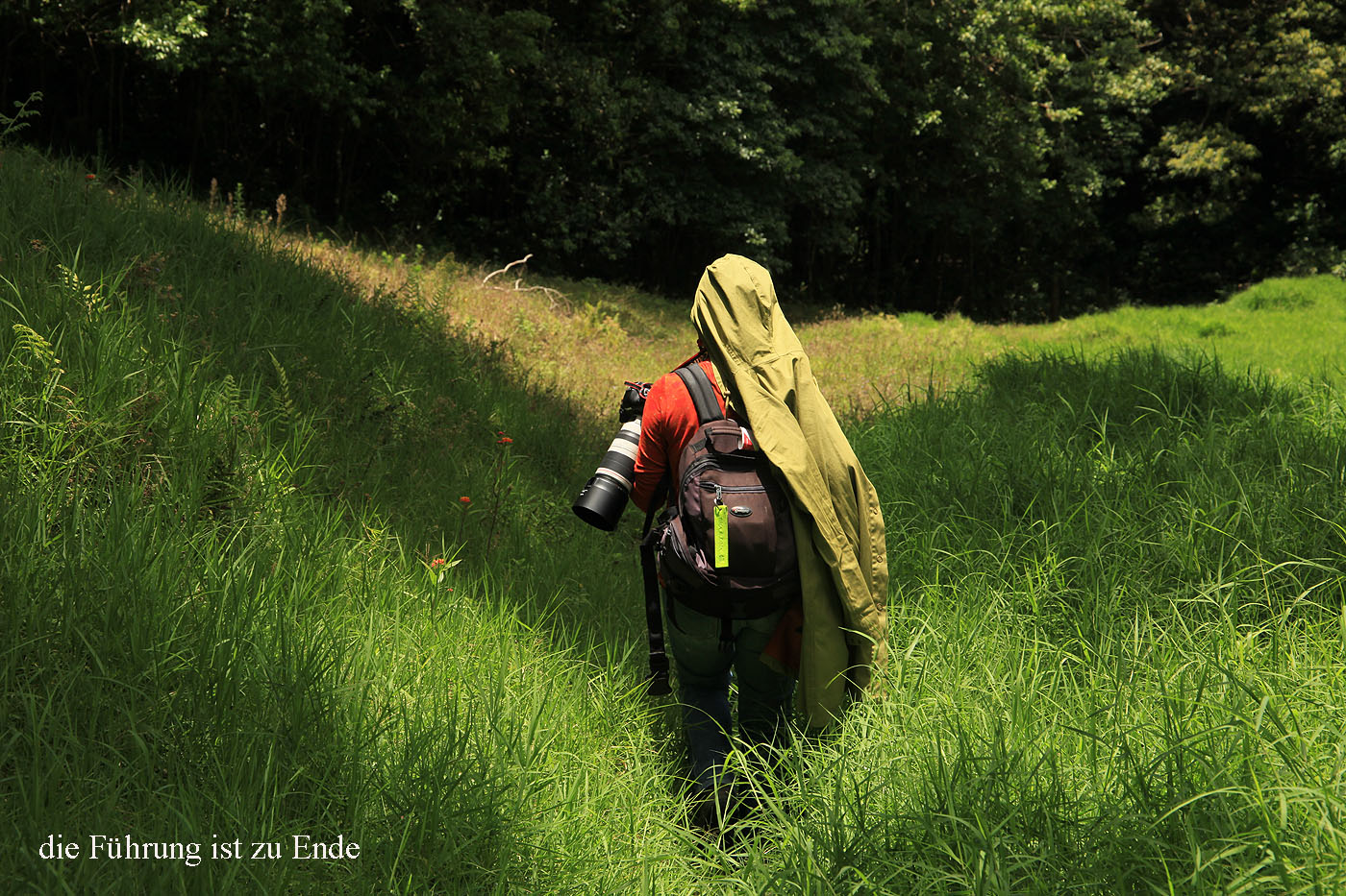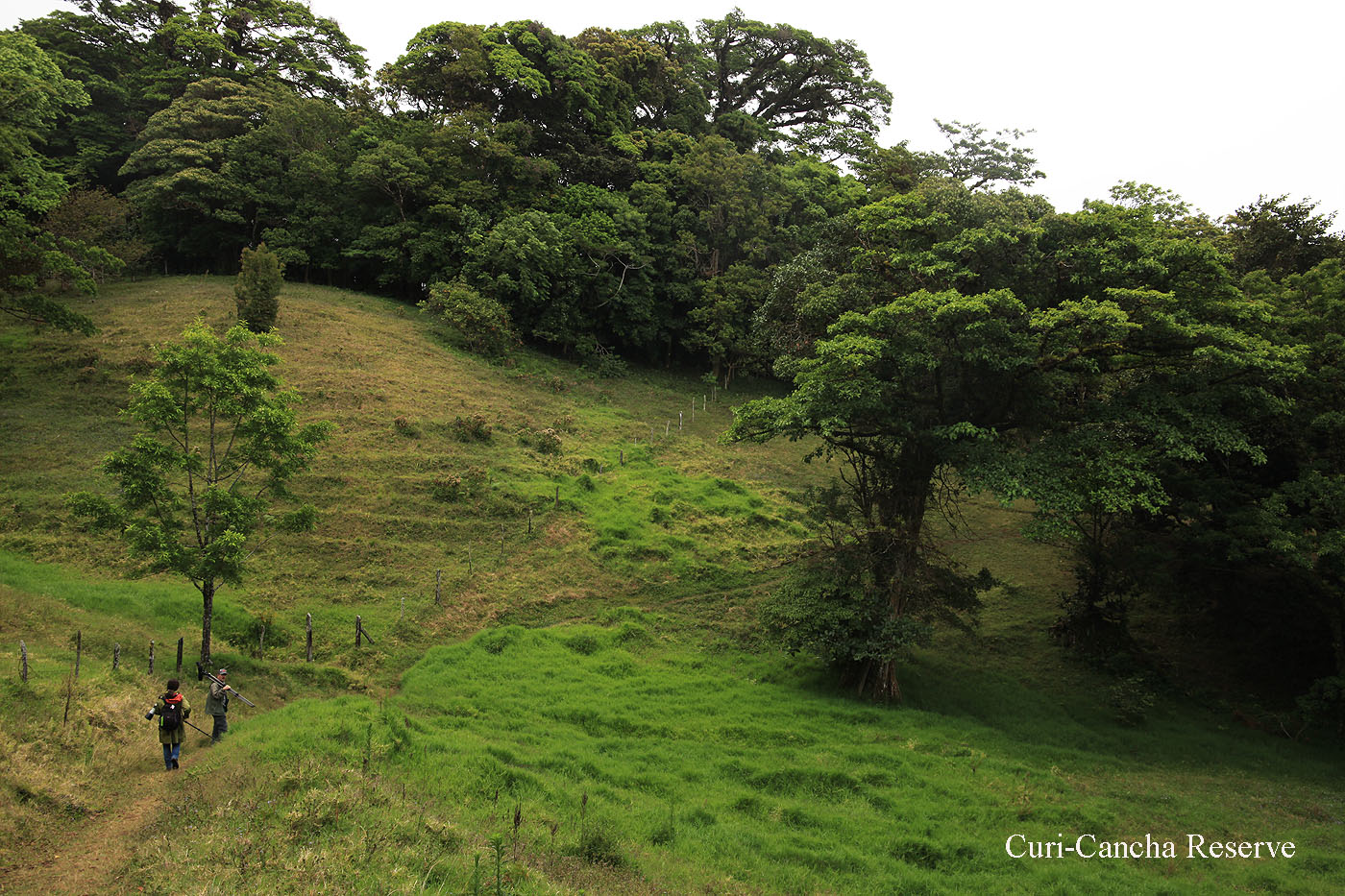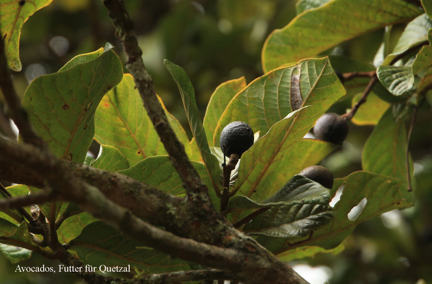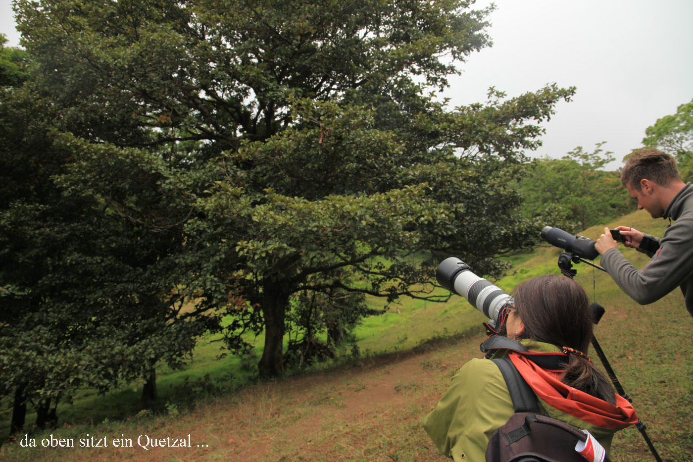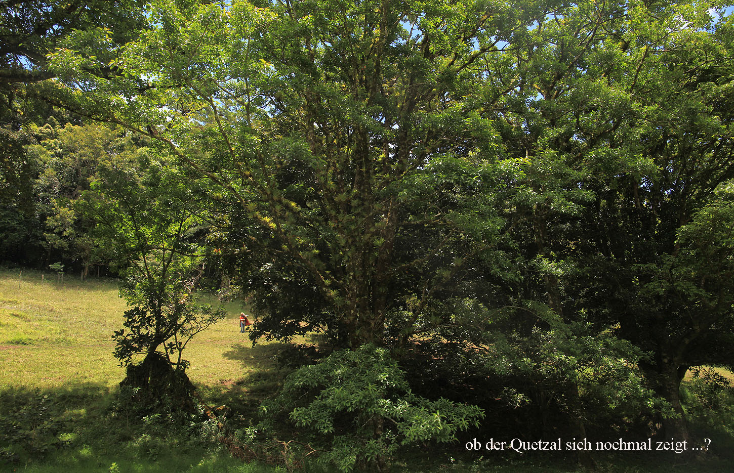 Wir verließen für kurze Zeit den Wald und durchschritten eine Wiese. Inmitten dieser Wiese steht ein Avocado-Baum, der vom Quetzal wegen seiner speziellen Früchte immer wieder gern aufgesucht wird. Wir konnten dort in sehr schlechtem Licht einen weiblichen Quetzal entdecken. Ein Männchen ließ sich aber zunächst nicht sehen. |