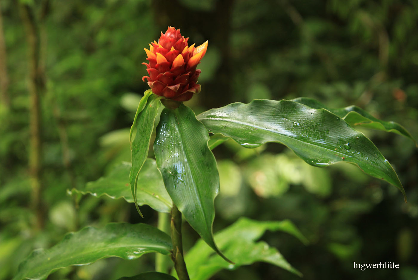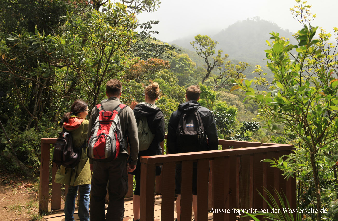 Auf dem Kamm oben angekommen, der Wasserscheide zwischen Atlantik und Pazifik, blies uns ein heftiger Wind entgegen, vermischt mit Sprühregen. Wir blieben nicht lange oben, da Adrián über Telefon inzwischen erfahren hatte, dass ein männlicher Quetzal sich in dem vorhin gesehenen Baum niedergelassen hatte. Schnell gingen wir über einen anderen Weg zurück, der ziemlich steil nach unten führte, was meine Knie ziemlich strapazierte. Trotz des schnellen Tempos machte ich unterwegs ein paar Fotos von einigen exotischen Pflanzen und Blüten. |