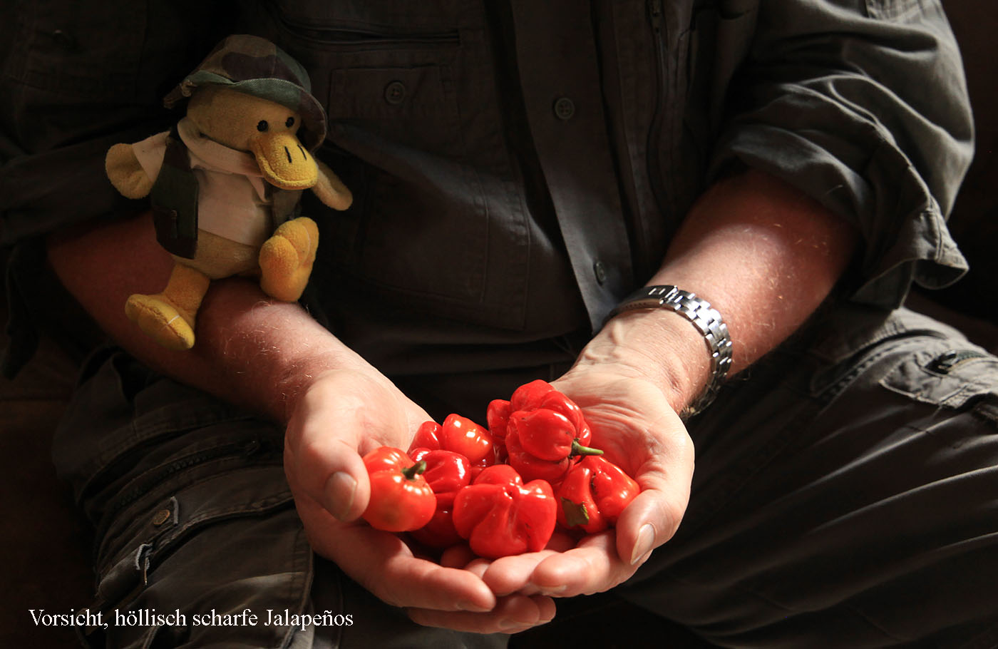 Ziemlich erschöpft kamen wir am Ausgang an. Dort kaufte ich sofort eine Flasche Wasser, die sehr erfrischte. Dazu hatte Tomoko noch Sandwichs und Kaffee gemacht, die wir uns jetzt schmecken ließen. Nun wurde es langsam Zeit zurückzufahren. Wir kauften noch 2 Stück Kuchen für den Nachmittagskaffee. Ein wunderschöner Blue-crowned Motmot saß vor unserem Chalet in einem Baum. Zurück im Zimmer aßen wir unseren Geburtstagskuchen und Kekse zusammen mit den Bären. Danach duschten wir erst mal ausgiebig. Ich war ziemlich erschöpft und legte mich für ein halbes Stündchen aufs Bett. Anschließend checkte ich mal meine Emails. Darunter waren zahlreiche Geburtstagsglückwünsche. Ich fing schon mal an Tagebuch zu schreiben. Gegen 15:00 h fuhren wir mal kurz hoch zu dem Gemüsegarten, der zum Hotel gehört und pflückten Salat und Kräuter fürs Abendessen. Da es dieses Jahr keine Tomaten gab, pflückte ich fröhlich ähnlich aussehende rote Früchte, davon eine große Menge. Tomoko stellte später mit großem Entsetzen fest, dass ich höllisch scharfe Jalapeños erwischt hatte. |