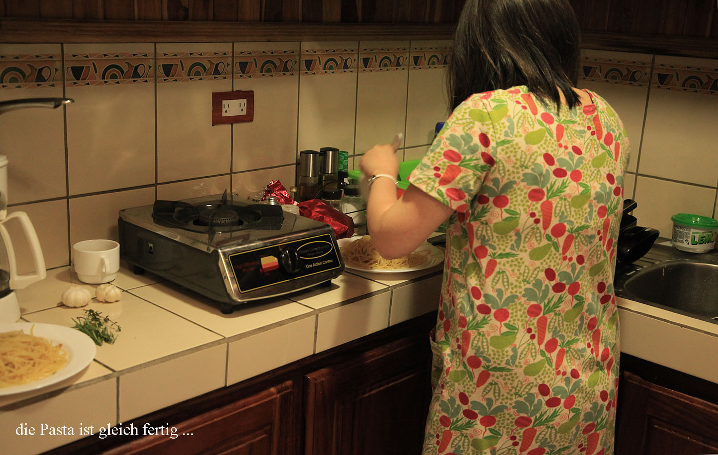 Im Supermarkt kauften wir noch ein paar Zutaten, dann ging es zurück zum Zimmer. Tomoko fing gleich mit den Kochvorbereitungen an. Ich schrieb weiter mein Tagebuch. Um 17:00 h war das Abendessen fertig. Zu meinem Geburtstag gab es eine leckere Pasta Pepperoncino mit einem schmackhaften Salat. Dazu tranken wir den Rest des Weißweins von gestern, sehr sehr lecker. Danach blieben wir noch etwas gemütlich im Schein einer Kerze sitzen, tranken einen Kaffee und quatschten noch ein bisschen. |
