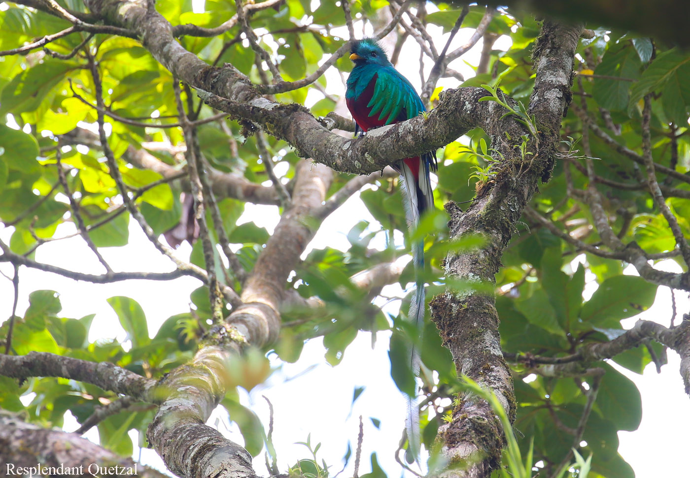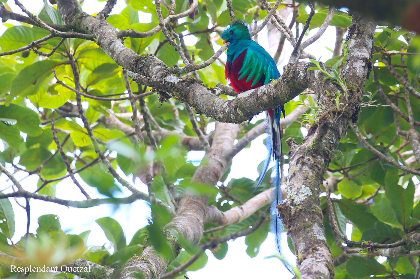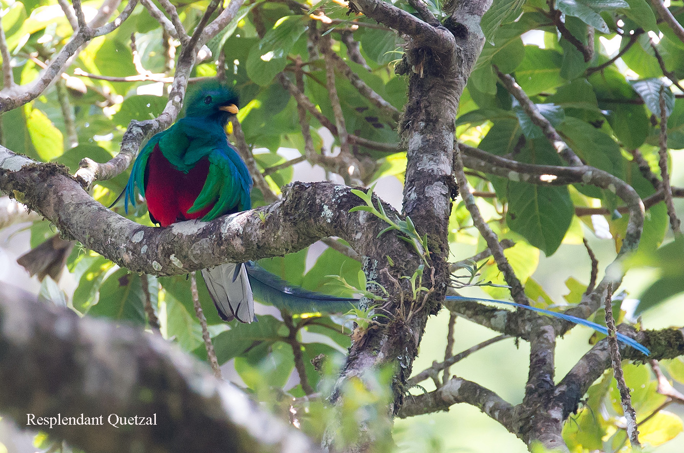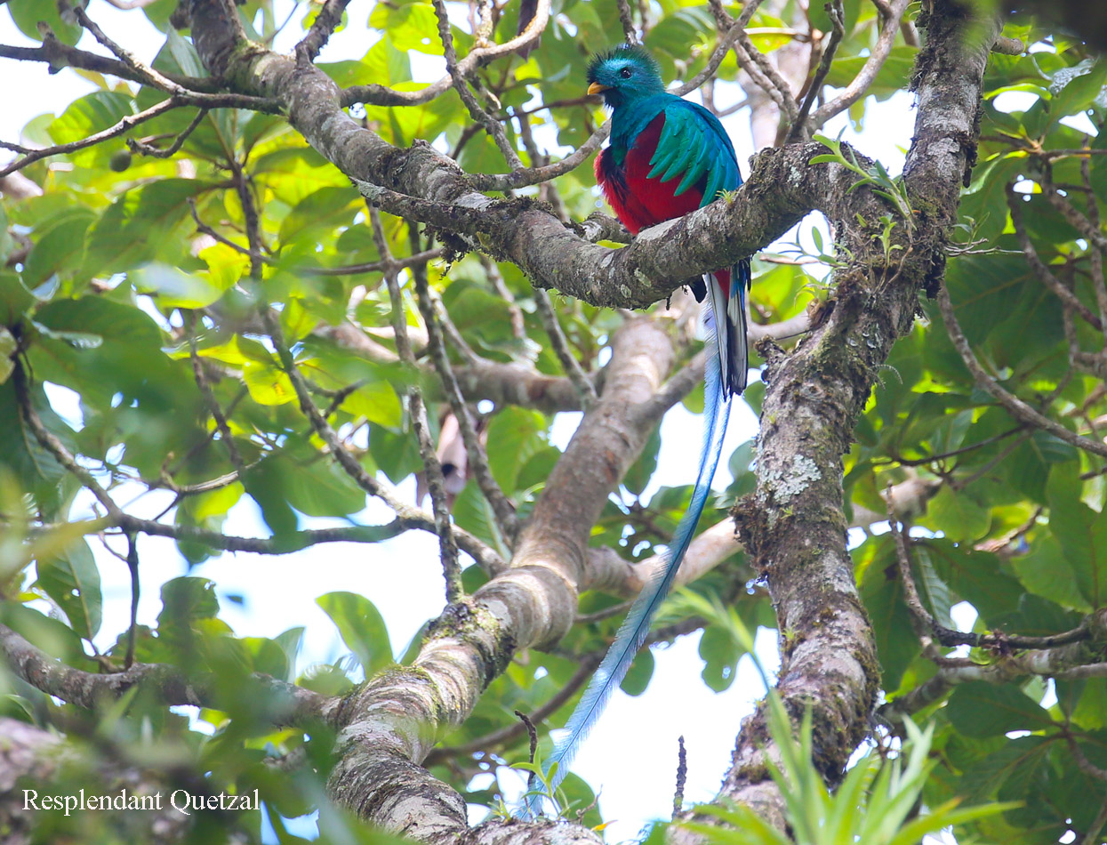 Ich war froh, als wir endlich den besagten Baum erreicht hatten. Gleich ließ ich mich auf mein Stühlchen nieder und ließ die anderen erst mal schauen. Nach ein paar Minuten hielt es mich aber nicht mehr auf meinem Stühlchen und ich konnte auch das Quetzal-Männchen mit seinem wunderschönen Gefieder und den langen Schwanzfedern bewundern. |