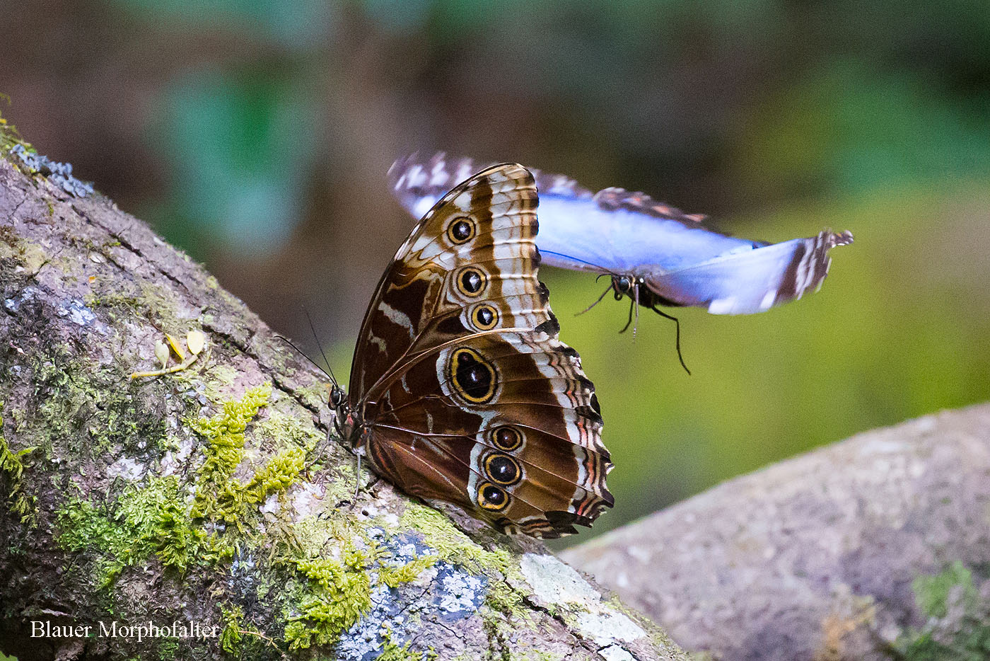 Ich ging mal runter unter den Baum, suchte mir eine bequeme Position aus und blieb mal für 20 Minuten im Gras sitzen. Hier war die Führung zu Ende. Wir bedankten uns bei Adrián und zahlten ihm das vereinbarte Honorar von 20,-$ pro Person. Er ging mit dem Rest der Gruppe zum Ausgang, während Tomoko und ich noch eine Weile dort blieben. Tomoko machte ein tolles Bild nach dem anderen vom Quetzal. Das wird ja eine Menge Arbeit später werden bei der Bilderauswahl für meinen Reisebericht... Ich hatte leider vergessen Wasser mitzunehmen. Deshalb gingen wir nach einiger Zeit auch zurück. Zwei wunderschöne Blaue Morphofalter flatterten über den Weg und blieben auf einem Ast in der Sonne sitzen. |