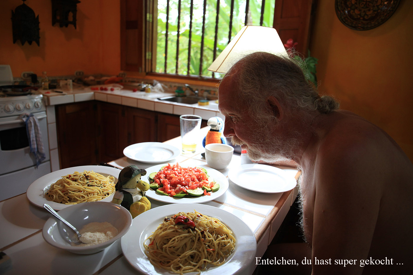 Gegen 16:00 h stand eine leckere Pasta und ein Avocado- Tomatensalat auf dem Tisch, bzw. der kleinen Bar, die die Küche vom übrigen Wohnraum trennte. Wir tranken ein Bier dazu, während es draußen so langsam mit dem Regen aufhörte. Nach dem Essen setzten wir uns mit unseren Netbooks auf die Terrasse und surften ein wenig im Internet. |
