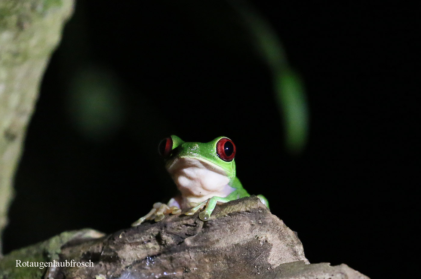Tomoko hörte um kurz nach 16:00 h einige Aras krächzen. Sie nahm ihre Kamera und ging alleine los in die Richtung, aus der sie das Krächzen hörte. Heute hatten wir eine Nachtwanderung mit Tracie "The Bug Lady", einer Expertin für Nachtführungen im Dschungel, gebucht, die um 19:00 h unmittelbar ans Abendessen anschloss. Also mussten wir zum Essen schon in entsprechender Kleidung erscheinen, lange Hose, langärmeliges Hemd, hohe Schuhe usw… Da wir 6 Personen waren, fuhren wir mit 2 Autos runter ins Dorf, wo wir uns um 19:30 h mit Tracies Mann Gian trafen, der uns zu Tracie bringen sollte, die an einer anderen Stelle auf uns wartete. Wir marschierten im Dunkeln los ein Stück am Strand entlang Richtung Westen. Wir sahen dabei einige Frösche. |