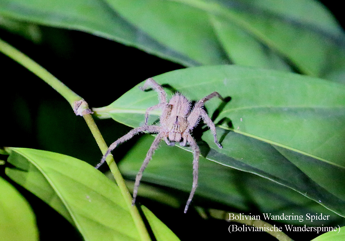 Ein Opossum huschte über uns hinweg. Ganz hoch in einem Baum konnten wir einen Kinkaju (Wickelbär) sehen. Eine besonders große Kakerlake nahm Tracie in ihre Hand, ebenfalls einige Spinnen. |