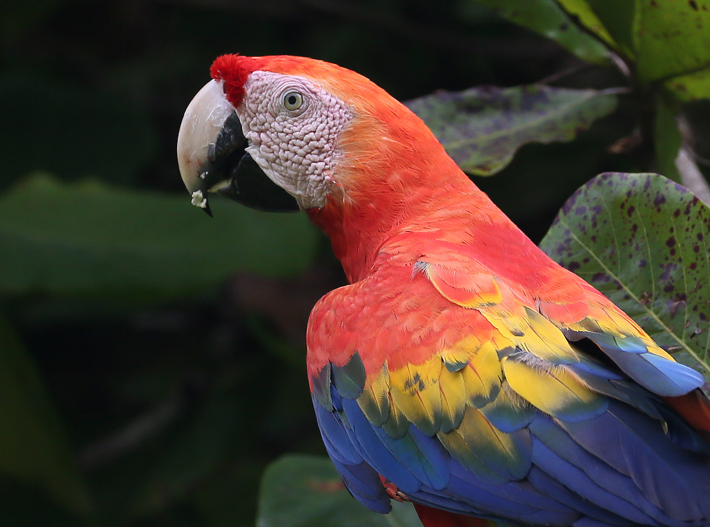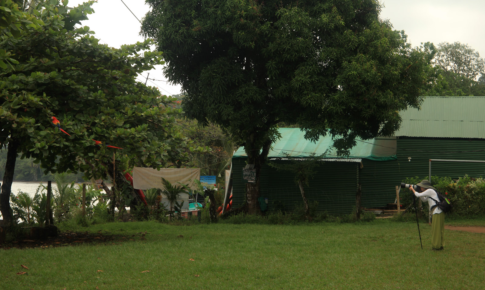 Eine nette einheimische Frau deutete auf einen Baum, in dem wieder 2 Lapas (Rote Aras) genüsslich grüne Mandel-Früchte verzehrten. Am heutigen Samstag war die Schule geschlossen, das Tor zum Schulgelände stand aber offen. Wir gingen hinein auf die grüne Wiese, die als Sportplatz dient. Von hier hatten wir einen guten Blick auf die Aras. |