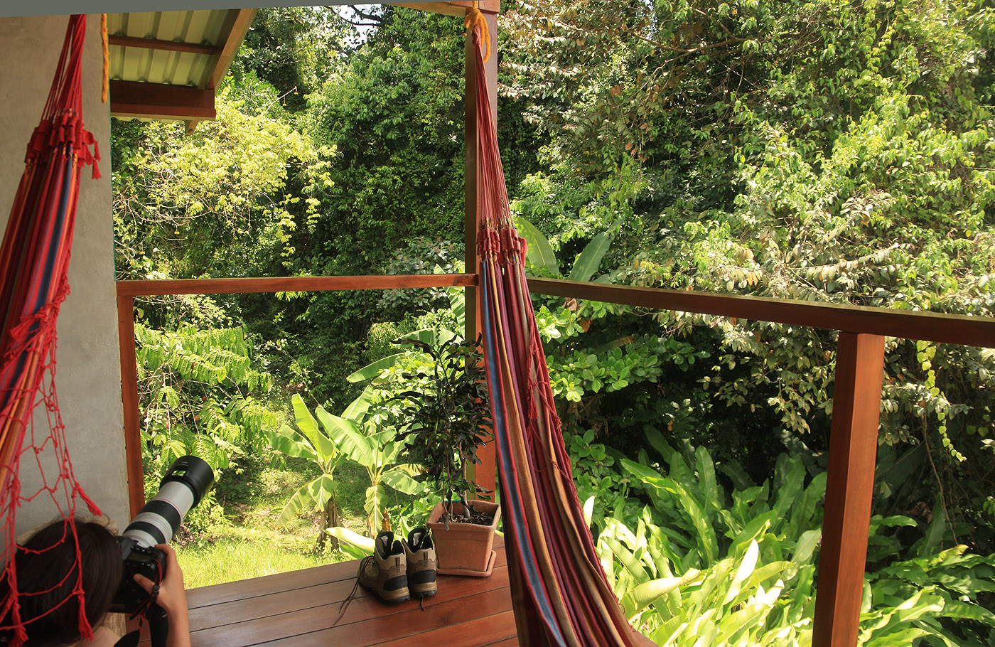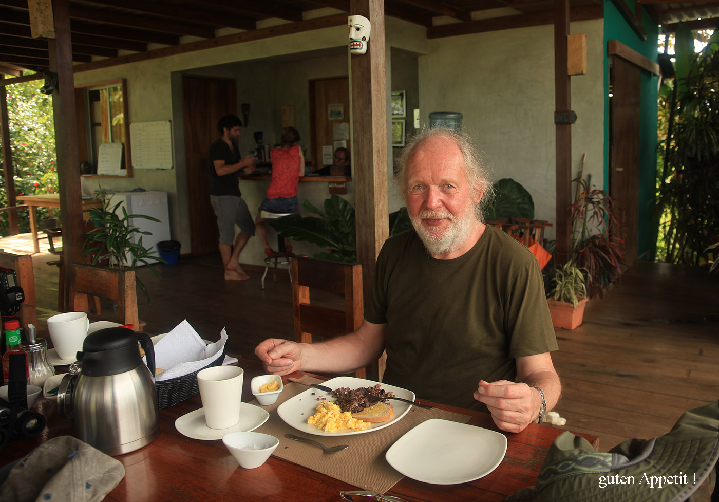 Beim Frühstück waren wir diesmal die letzten. Die beiden netten jungen Franzosen, Fanny und Guillaume, verabschiedeten sich. Mit Juan sprachen wir noch eine Weile, bevor wir uns in unseren Bungalow zurückzogen. Dort duschten wir erst mal gründlich. Wasser sparen war nach dem ergiebigen Regen nicht mehr unbedingt nötig. Trotzdem übertrieben wir beim Wasserverbrauch nicht. Wir blieben den ganzen Vormittag dort und beobachteten die vielen kleinen Vögel von unserer Terrasse, bzw. aus dem Badezimmer, das wie ein Hide gebaut ist. Dabei ließen wir von Zeit zu Zeit etwas kaltes Wasser aus der Dusche über uns rieseln, was sehr angenehm war. |